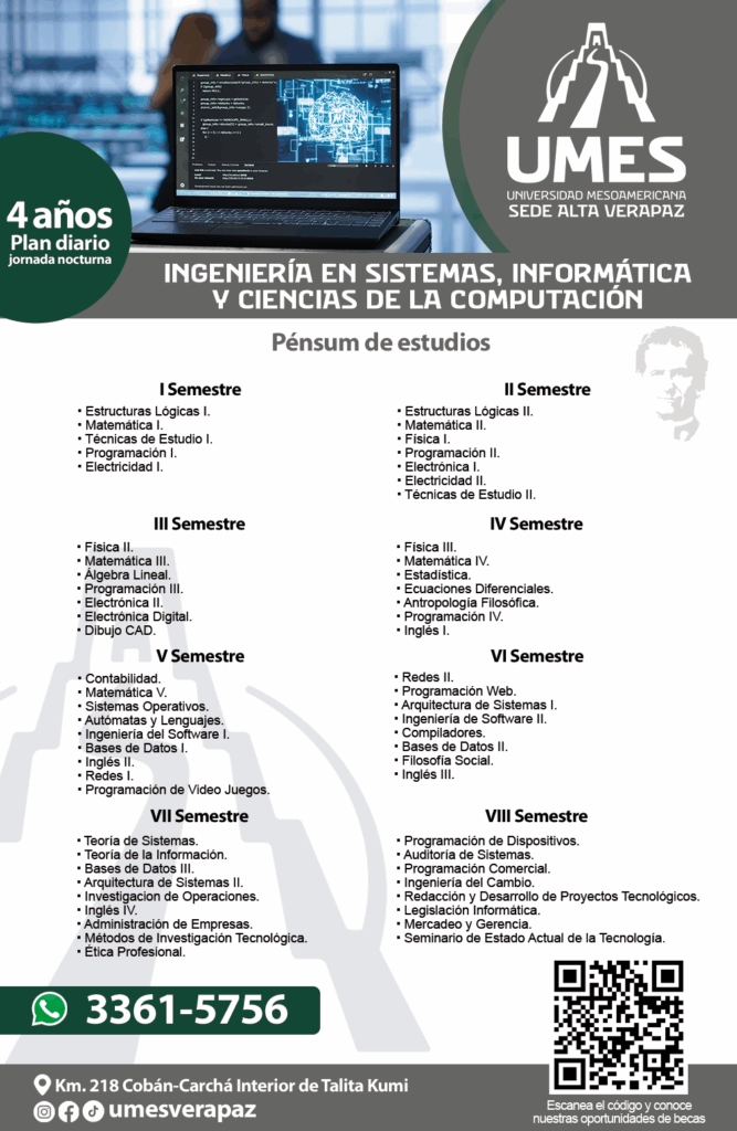 Se especializa en las áreas de programación, bases de datos, diseño de sistemas, sistemas, administración de proyectos, operativos y redes; además, se complementa con el área de electrónica, garantizando un profesional que será capaz de analizar, diseñar, implementar y asesorar a todo tipo de organización para dar solución a problemas de su competencia. La carrera se propone la formación integral de profesionales con altos valores éticos y morales.